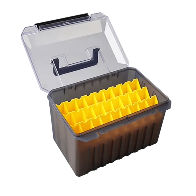 Apesar de seu tamanho compacto, este estojo oferece 27 compartimentos, proporcionando amplo espaço para armazenar várias iscas sem ocupar muito espaço. No caso de armazenamento de jigs de metal, que ocupam menos espaço, eles podem ser armazenados dois a dois, chegando à quantidade de 54 iscas no total!